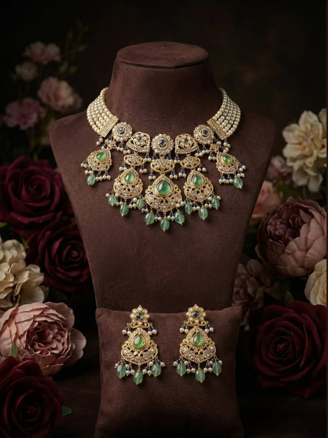 𝐓𝐡𝐞 𝐧𝐞𝐜𝐤𝐥𝐚𝐜𝐞 𝐟𝐞𝐚𝐭𝐮𝐫𝐞𝐬 𝐚 𝐥𝐮𝐱𝐮𝐫𝐢𝐨𝐮𝐬 𝐦𝐮𝐥𝐭𝐢-𝐬𝐭𝐫𝐚𝐧𝐝 𝐩𝐞𝐚𝐫𝐥 𝐦𝐚𝐥𝐚 𝐭𝐡𝐚𝐭 𝐠𝐫𝐚𝐜𝐞𝐟𝐮𝐥𝐥𝐲 𝐬𝐮𝐩𝐩𝐨𝐫𝐭𝐬 𝐨𝐫𝐧𝐚𝐭𝐞 𝐡𝐚𝐧𝐝𝐜𝐫𝐚𝐟𝐭𝐞𝐝 𝐞𝐥𝐞𝐦𝐞𝐧𝐭𝐬 𝐚𝐝𝐨𝐫𝐧𝐞𝐝 𝐰𝐢𝐭𝐡 𝐯𝐢𝐛𝐫𝐚𝐧𝐭 𝐠𝐫𝐞𝐞𝐧 𝐬𝐭𝐨𝐧𝐞𝐬 𝐚𝐧𝐝 𝐝𝐞𝐭𝐚𝐢𝐥𝐞𝐝 𝐠𝐨𝐥𝐝 𝐰𝐨𝐫𝐤. 𝐃𝐞𝐥𝐢𝐜𝐚𝐭𝐞 𝐛𝐞𝐚𝐝 𝐝𝐫𝐨𝐩𝐬 𝐚𝐝𝐝 𝐫𝐡𝐲𝐭𝐡𝐦 𝐚𝐧𝐝 𝐦𝐨𝐯𝐞𝐦𝐞𝐧𝐭, 𝐞𝐧𝐡𝐚𝐧𝐜𝐢𝐧𝐠 𝐭𝐡𝐞 𝐜𝐞𝐫𝐞𝐦𝐨𝐧𝐢𝐚𝐥 𝐞𝐥𝐞𝐠𝐚𝐧𝐜𝐞 𝐨𝐟 𝐭𝐡𝐞 𝐝𝐞𝐬𝐢𝐠𝐧. 𝐓𝐡𝐞 𝐦𝐚𝐭𝐜𝐡𝐢𝐧𝐠 𝐞𝐚𝐫𝐫𝐢𝐧𝐠𝐬 𝐦𝐢𝐫𝐫𝐨𝐫 𝐭𝐡𝐞 𝐧𝐞𝐜𝐤𝐥𝐚𝐜𝐞’𝐬 𝐢𝐧𝐭𝐫𝐢𝐜𝐚𝐭𝐞 𝐝𝐞𝐭𝐚𝐢𝐥𝐢𝐧𝐠, 𝐜𝐨𝐦𝐩𝐥𝐞𝐭𝐢𝐧𝐠 𝐭𝐡𝐞 𝐞𝐧𝐬𝐞𝐦𝐛𝐥𝐞 𝐰𝐢𝐭𝐡 𝐩𝐞𝐫𝐟𝐞𝐜𝐭 𝐡𝐚𝐫𝐦𝐨𝐧𝐲 𝐚𝐧𝐝 𝐛𝐚𝐥𝐚𝐧𝐜𝐞.