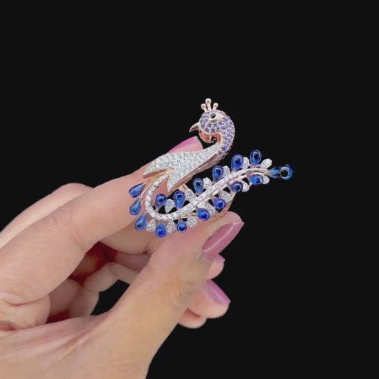 𝗧𝗵𝗶𝘀 𝗺𝗮𝗷𝗲𝘀𝘁𝗶𝗰 𝗽𝗲𝗮𝗰𝗼𝗰𝗸-𝗶𝗻𝘀𝗽𝗶𝗿𝗲𝗱 𝘀𝘁𝗮𝘁𝗲𝗺𝗲𝗻𝘁 𝗽𝗶𝗲𝗰𝗲 𝗶𝘀 𝗲𝘅𝗾𝘂𝗶𝘀𝗶𝘁𝗲𝗹𝘆 𝗰𝗿𝗮𝗳𝘁𝗲𝗱 𝗶𝗻 𝟭𝟰𝗞 𝗴𝗼𝗹𝗱, 𝗰𝗲𝗹𝗲𝗯𝗿𝗮𝘁𝗶𝗻𝗴 𝗮𝗿𝘁𝗶𝘀𝘁𝗿𝘆, 𝗲𝗹𝗲𝗴𝗮𝗻𝗰𝗲, 𝗮𝗻𝗱 𝗴𝗿𝗮𝗻𝗱𝗲𝘂𝗿. 𝗗𝗲𝘀𝗶𝗴𝗻𝗲𝗱 𝘄𝗶𝘁𝗵 𝗳𝗹𝗼𝘄𝗶𝗻𝗴 𝗰𝘂𝗿𝘃𝗲𝘀 𝗮𝗻𝗱 𝗶𝗻𝘁𝗿𝗶𝗰𝗮𝘁𝗲 𝗱𝗲𝘁𝗮𝗶𝗹𝗶𝗻𝗴, 𝘁𝗵𝗲 𝗽𝗶𝗲𝗰𝗲 𝗳𝗲𝗮𝘁𝘂𝗿𝗲𝘀 𝗿𝗶𝗰𝗵 𝗯𝗹𝘂𝗲 𝗰𝗼𝗹𝗼𝗿 𝘀𝘁𝗼𝗻𝗲𝘀 𝘁𝗼𝘁𝗮𝗹𝗶𝗻𝗴 𝟰.𝟲𝟭 𝗰𝗮𝗿𝗮𝘁𝘀, 𝗮𝗿𝘁𝗶𝘀𝘁𝗶𝗰𝗮𝗹𝗹𝘆 𝗮𝗿𝗿𝗮𝗻𝗴𝗲𝗱 𝘁𝗼 𝗿𝗲𝗳𝗹𝗲𝗰𝘁 𝘁𝗵𝗲 𝗴𝗿𝗮𝗰𝗲𝗳𝘂𝗹 𝗽𝗹𝘂𝗺𝗮𝗴𝗲 𝗼𝗳 𝗮 𝗽𝗲𝗮𝗰𝗼𝗰𝗸.