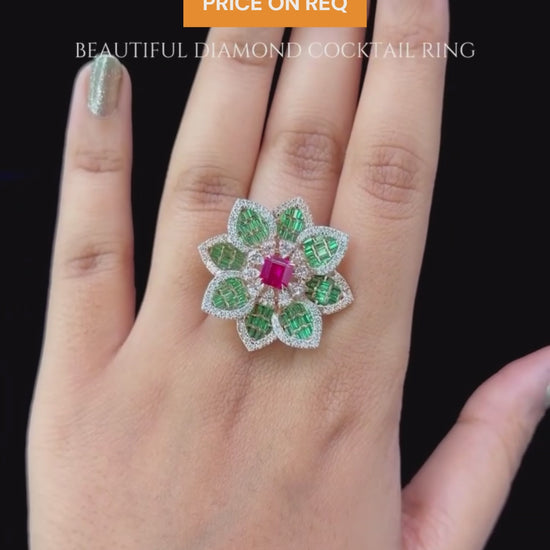 𝗧𝗵𝗶𝘀 𝗲𝘅𝗾𝘂𝗶𝘀𝗶𝘁𝗲 𝗳𝗹𝗼𝗿𝗮𝗹 𝘀𝘁𝗮𝘁𝗲𝗺𝗲𝗻𝘁 𝗿𝗶𝗻𝗴 𝗶𝘀 𝗺𝗮𝘀𝘁𝗲𝗿𝗳𝘂𝗹𝗹𝘆 𝗰𝗿𝗮𝗳𝘁𝗲𝗱 𝗶𝗻 𝟭𝟰𝗞 𝗴𝗼𝗹𝗱, 𝗯𝗹𝗲𝗻𝗱𝗶𝗻𝗴 𝘁𝗶𝗺𝗲𝗹𝗲𝘀𝘀 𝗲𝗹𝗲𝗴𝗮𝗻𝗰𝗲 𝘄𝗶𝘁𝗵 𝘃𝗶𝗯𝗿𝗮𝗻𝘁 𝗮𝗿𝘁𝗶𝘀𝘁𝗿𝘆. 𝗗𝗲𝘀𝗶𝗴𝗻𝗲𝗱 𝘁𝗼 𝗰𝗮𝗽𝘁𝗶𝘃𝗮𝘁𝗲, 𝘁𝗵𝗲 𝗿𝗶𝗻𝗴 𝘀𝗵𝗼𝘄𝗰𝗮𝘀𝗲𝘀 𝗮 𝗿𝗮𝗱𝗶𝗮𝗻𝘁 𝗮𝗿𝗿𝗮𝗻𝗴𝗲𝗺𝗲𝗻𝘁 𝗼𝗳 𝗿𝗶𝗰𝗵 𝗴𝗿𝗲𝗲𝗻 𝗰𝗼𝗹𝗼𝗿 𝘀𝘁𝗼𝗻𝗲𝘀 𝗮𝗰𝗰𝗲𝗻𝘁𝗲𝗱 𝗯𝘆 𝗮 𝘀𝘁𝗿𝗶𝗸𝗶𝗻𝗴 𝗽𝗶𝗻𝗸 𝗰𝗲𝗻𝘁𝗲𝗿 𝘀𝘁𝗼𝗻𝗲, 𝘁𝗼𝗴𝗲𝘁𝗵𝗲𝗿 𝘁𝗼𝘁𝗮𝗹𝗶𝗻𝗴 𝟮.𝟮𝟵 𝗰𝗮𝗿𝗮𝘁𝘀, 𝗳𝗼𝗿𝗺𝗶𝗻𝗴 𝗮 𝗯𝗼𝗹𝗱 𝘆𝗲𝘁 𝗴𝗿𝗮𝗰𝗲𝗳𝘂𝗹 𝗳𝗹𝗼𝗿𝗮𝗹 𝗺𝗼𝘁𝗶𝗳.