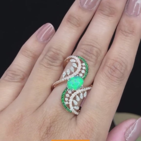 𝐀 𝐠𝐫𝐚𝐜𝐞𝐟𝐮𝐥 𝐛𝐥𝐞𝐧𝐝 𝐨𝐟 𝐛𝐫𝐢𝐥𝐥𝐢𝐚𝐧𝐜𝐞 𝐚𝐧𝐝 𝐜𝐨𝐧𝐭𝐞𝐦𝐩𝐨𝐫𝐚𝐫𝐲 𝐚𝐫𝐭𝐢𝐬𝐭𝐫𝐲, 𝐭𝐡𝐢𝐬 𝐞𝐱𝐪𝐮𝐢𝐬𝐢𝐭𝐞 𝐫𝐢𝐧𝐠 𝐛𝐲 𝐎𝐬𝐰𝐚𝐥 𝐃𝐢𝐚𝐦𝐨𝐧𝐝𝐬 𝐢𝐬 𝐝𝐞𝐬𝐢𝐠𝐧𝐞𝐝 𝐭𝐨 𝐬𝐭𝐚𝐧𝐝 𝐨𝐮𝐭. 𝐂𝐫𝐚𝐟𝐭𝐞𝐝 𝐢𝐧 𝐥𝐮𝐱𝐮𝐫𝐢𝐨𝐮𝐬 𝟏𝟒𝐊 𝐫𝐨𝐬𝐞 𝐠𝐨𝐥𝐝, 𝐭𝐡𝐞 𝐝𝐞𝐬𝐢𝐠𝐧 𝐟𝐞𝐚𝐭𝐮𝐫𝐞𝐬 𝐚 𝐟𝐥𝐨𝐰𝐢𝐧𝐠, 𝐥𝐞𝐚𝐟-𝐢𝐧𝐬𝐩𝐢𝐫𝐞𝐝 𝐬𝐢𝐥𝐡𝐨𝐮𝐞𝐭𝐭𝐞 𝐞𝐦𝐛𝐫𝐚𝐜𝐢𝐧𝐠 𝐚 𝐜𝐚𝐩𝐭𝐢𝐯𝐚𝐭𝐢𝐧𝐠 𝐜𝐞𝐧𝐭𝐞𝐫 𝐬𝐭𝐨𝐧𝐞 — 𝐜𝐫𝐞𝐚𝐭𝐢𝐧𝐠 𝐚 𝐩𝐞𝐫𝐟𝐞𝐜𝐭 𝐡𝐚𝐫𝐦𝐨𝐧𝐲 𝐨𝐟 𝐬𝐩𝐚𝐫𝐤𝐥𝐞 𝐚𝐧𝐝 𝐜𝐨𝐥𝐨𝐫.